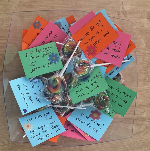 תלמידי יא'3 ערכו קבלת פנים לתלמידי י'3 , המסגרת המיזם התלמידים הכינו טיפים אישיים לשנה הראשונה בתיכון, מלווים בסוכריות קשת בענן